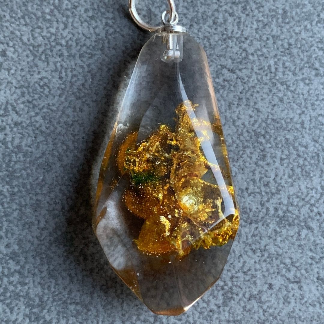 Zatopiony w żywicy jubilerskiej kawałek… złoto zielonego … no właśnie, co Ci przychodzi do głowy? Intrygujący i niecodzienny.