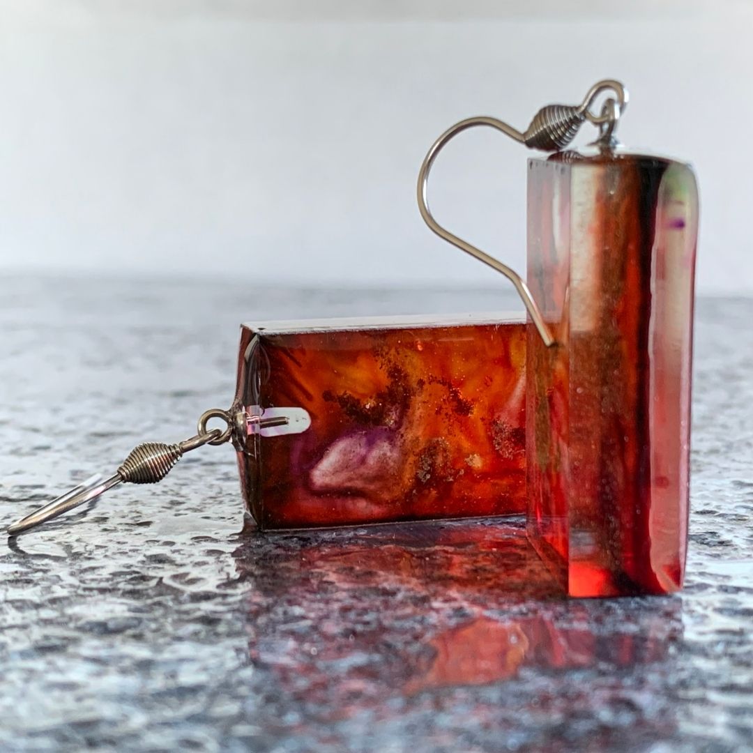 Czerwone kolczyki – prostopadłościany z żywicy jubilerskiej.