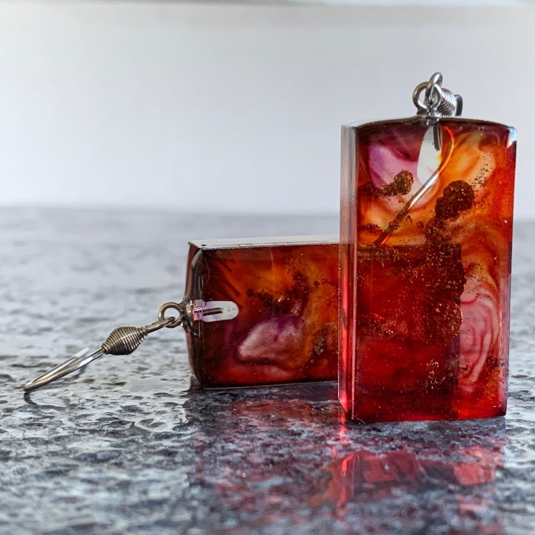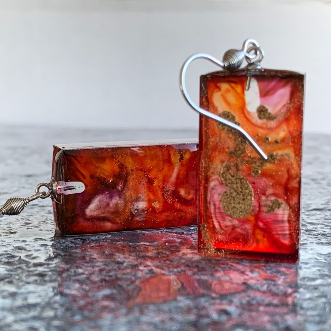 Czerwone prostopadłościany z żywicy jubilerskiej z zatopionymi smugami złota. Niczym zastygły ogień. Lekki, ręcznie wylewany drobiazg, migotliwy i radosny.