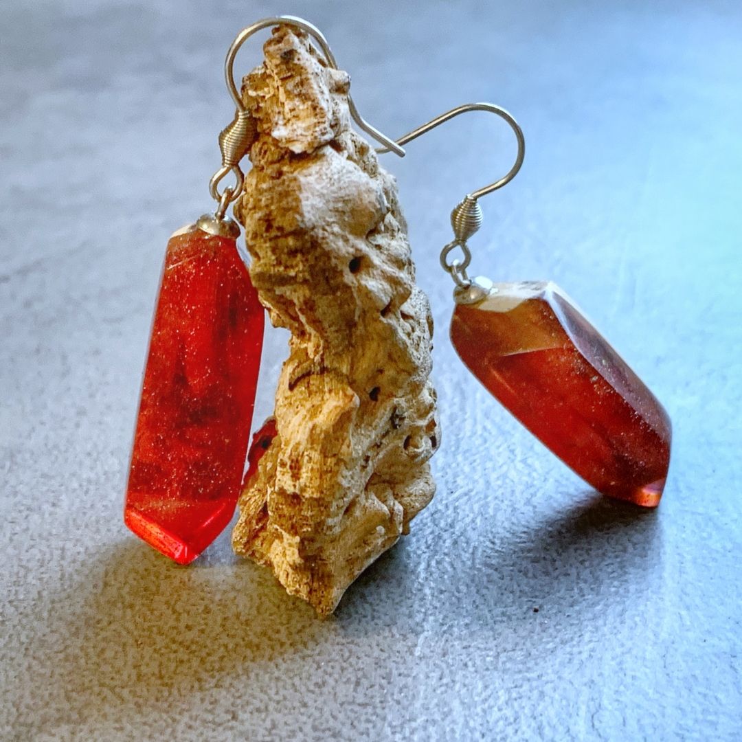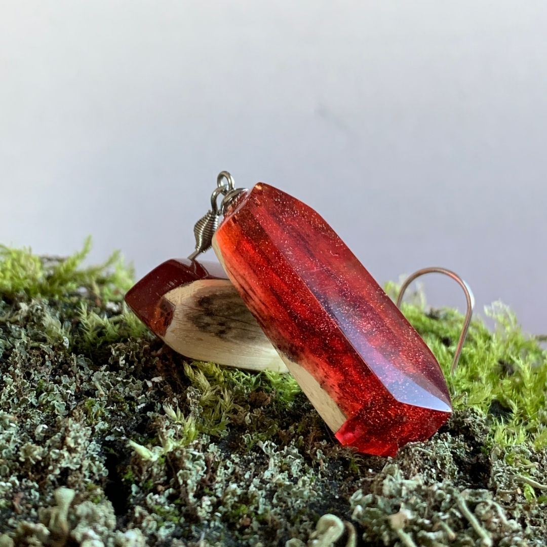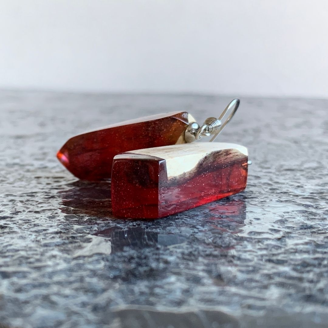 Kolczyki z czerwonej żywicy jubilerskiej z drewnem. Nieregularne, asymetryczne. Niepokorne i zadziorne. Jak Ty. Lekki, ręcznie wylewany drobiazg, migotliwy i radosny.
