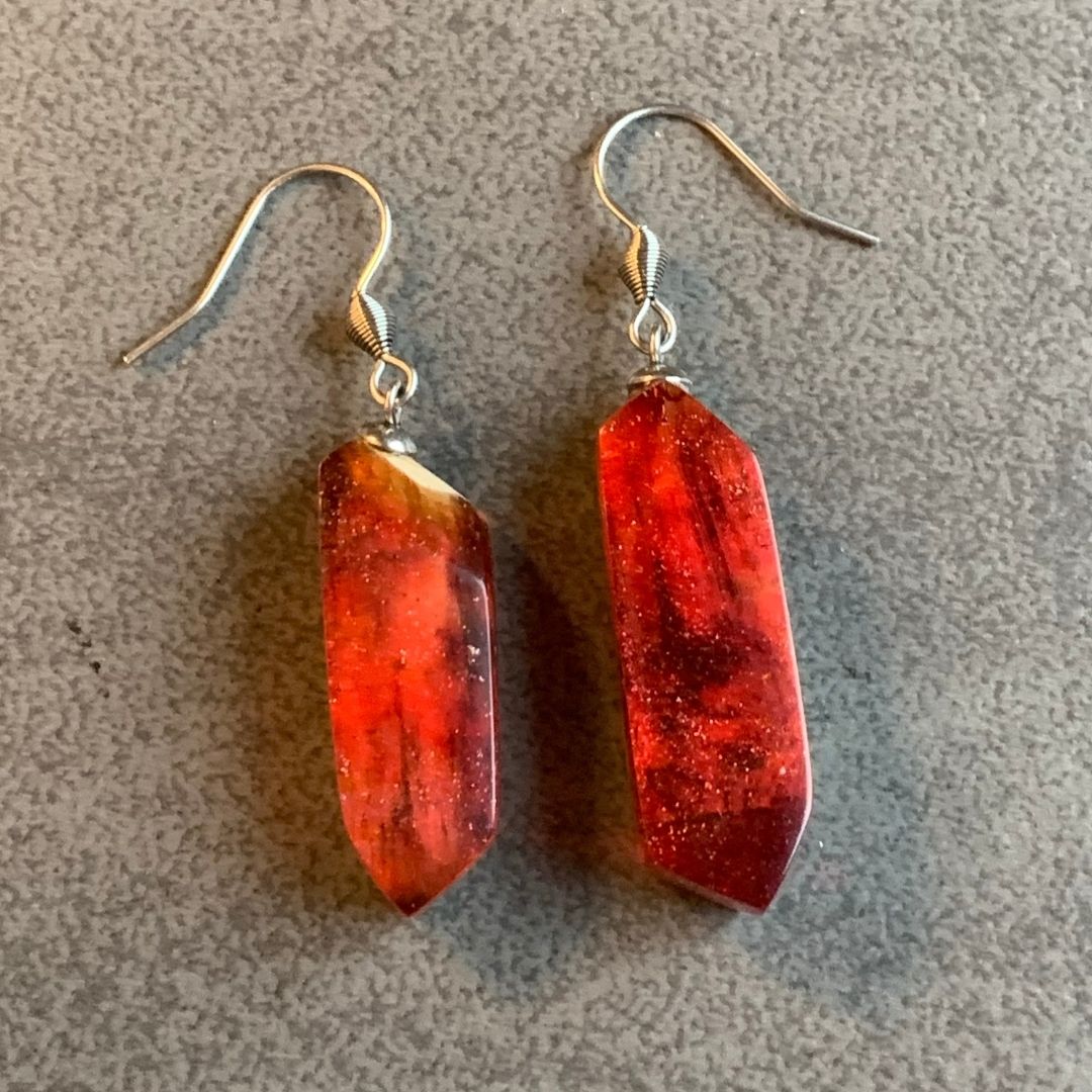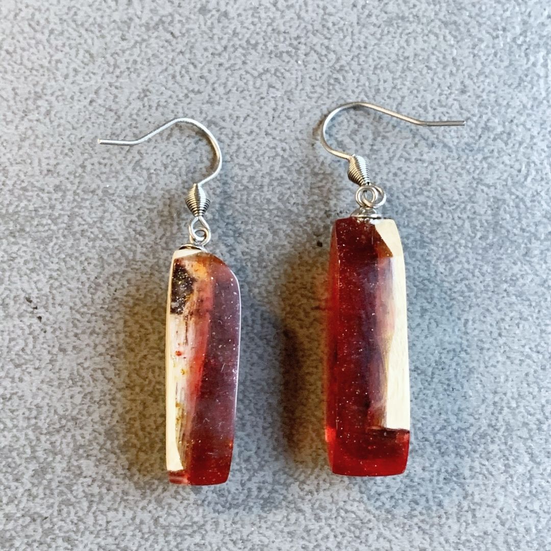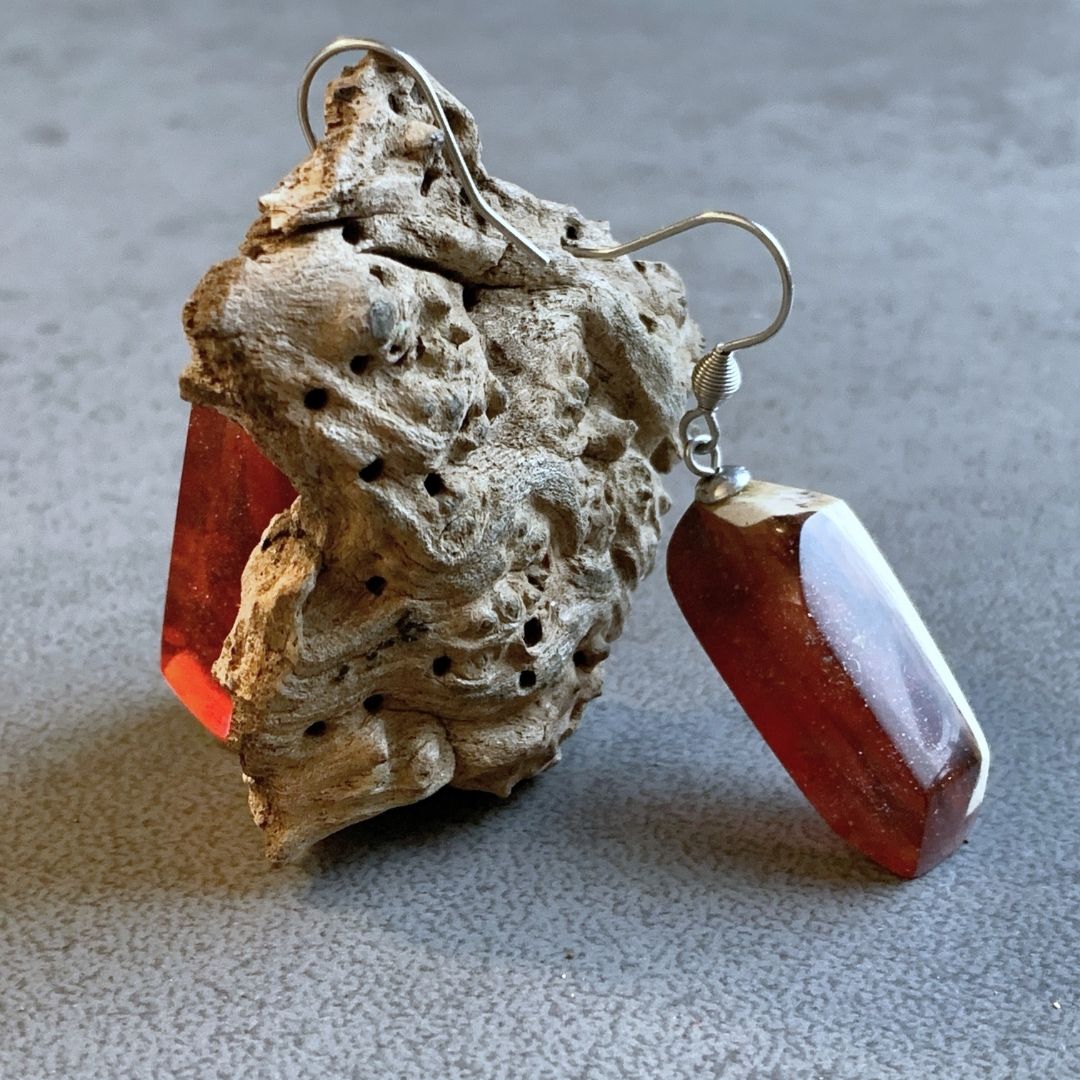 Kolczyki z czerwonej żywicy jubilerskiej z drewnem. Nieregularne, asymetryczne. Niepokorne i zadziorne. Jak Ty. Lekki, ręcznie wylewany drobiazg, migotliwy i radosny.