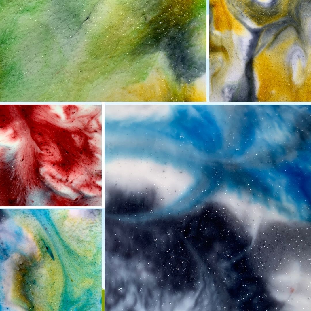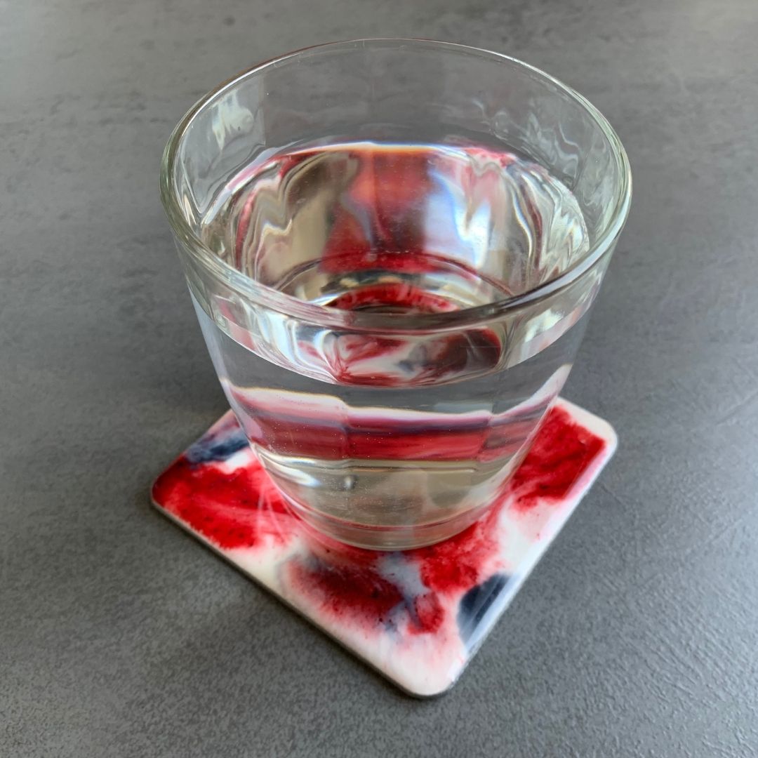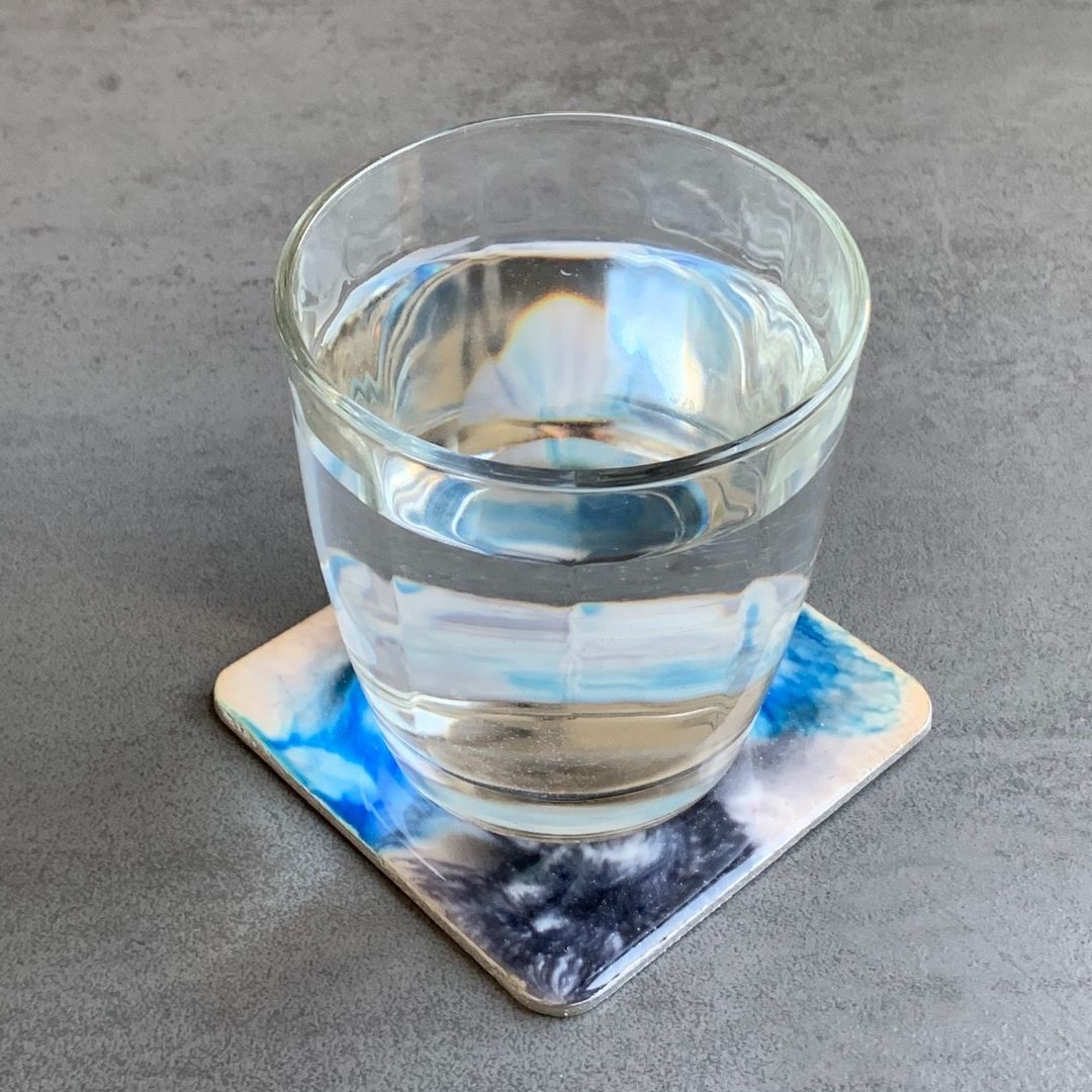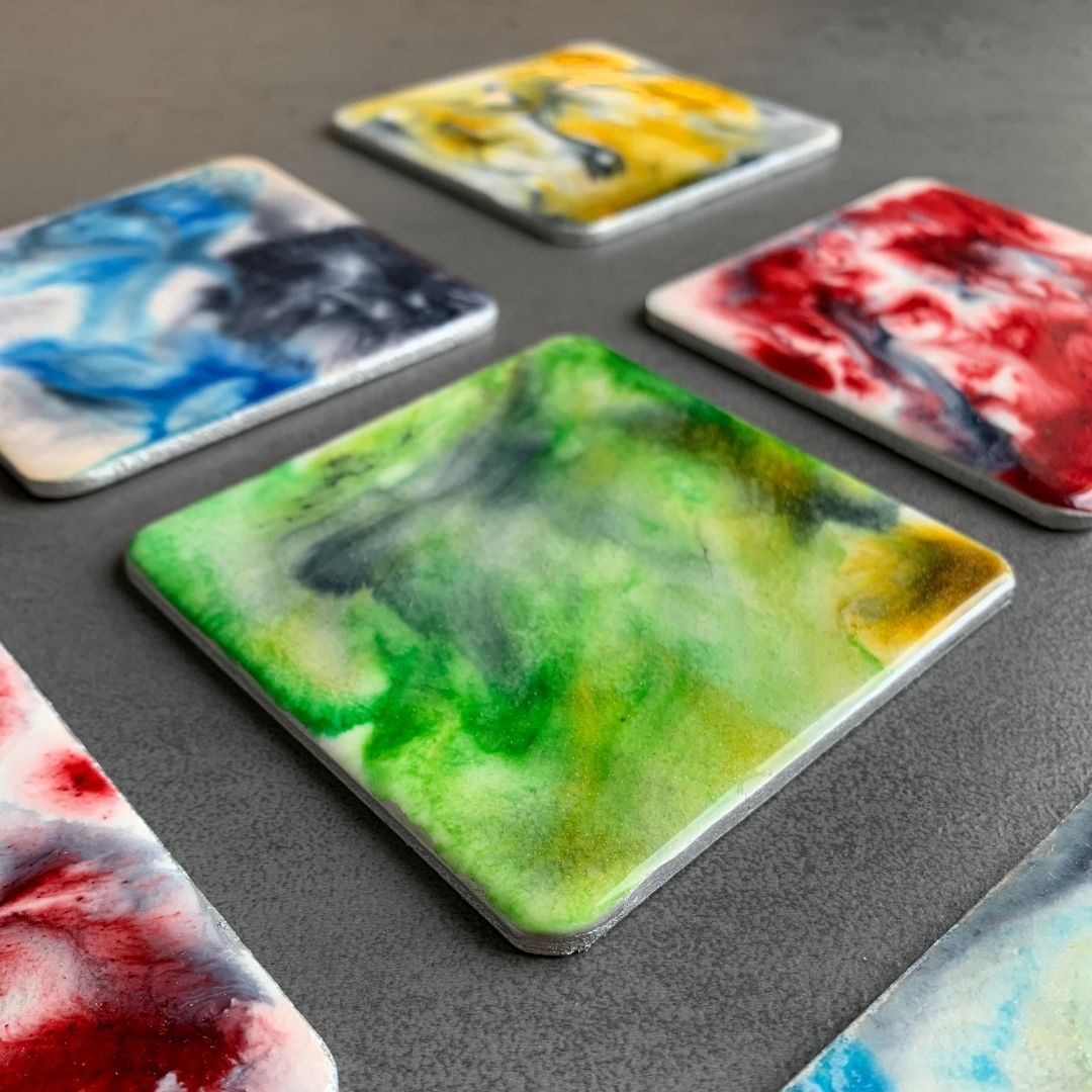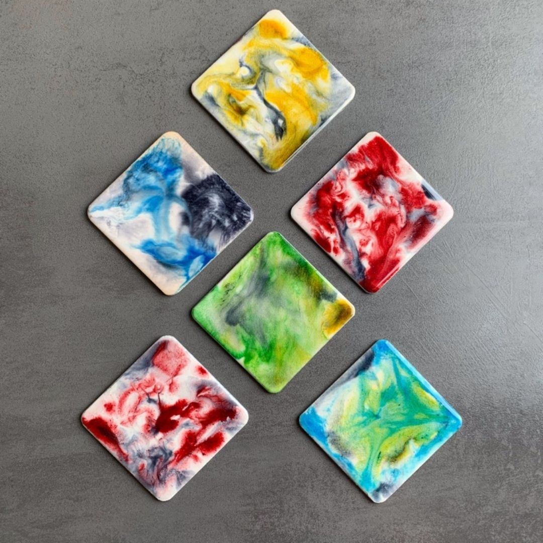 Komplet 5 podkładek pod zimne napoje z fantazyjnym, niepowtarzalnym wzorem z żywicy jubilerskiej. Podkładki są wykonane z drewna, brzegi są zabezpieczone srebrną farbą.