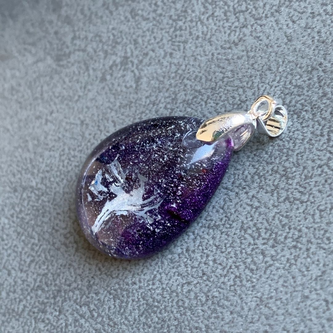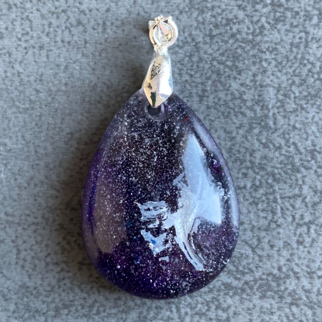 Wisior z żywicy jubilerskiej na metalowej zawieszce.