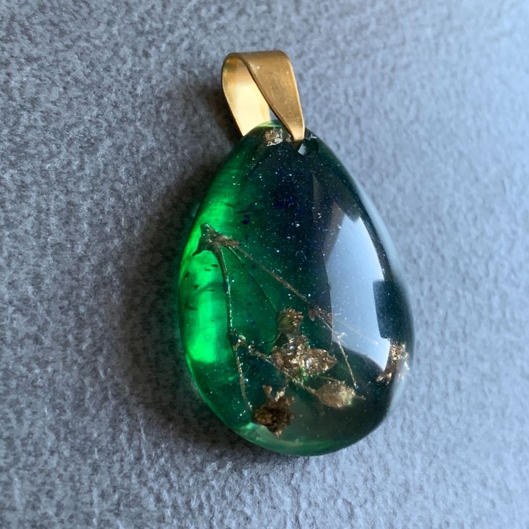 Jezioro z przejrzystą , zieloną wodą, zatopionymi roślinami i kawałkami gałązek. A teraz wykrój z niego kroplę i stwórz wisiorek. Oto on.