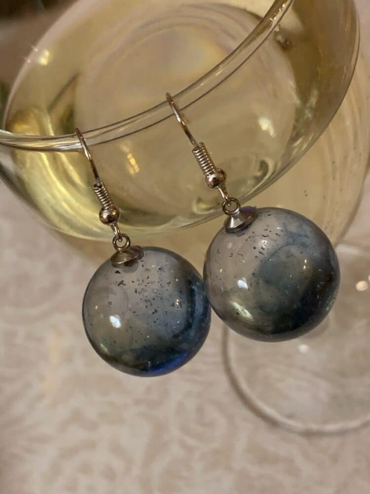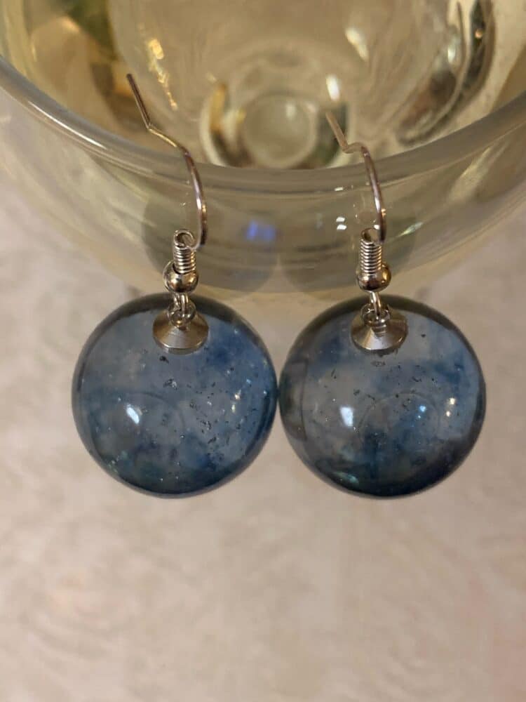 Fantastyczne kuliste kolczyki, które zwrócą na Ciebie uwagę i pomogą wyróżnić się z tłumu. Niebieski kolor jest niczym woda zaklęta w szkło. Zawieszka lekko wkłada się w płatek ucha, co czyni je wygodne w noszeniu. Lekkie, ręcznie wylewane z żywicy jubilerskiej, migotliwe i radosne.