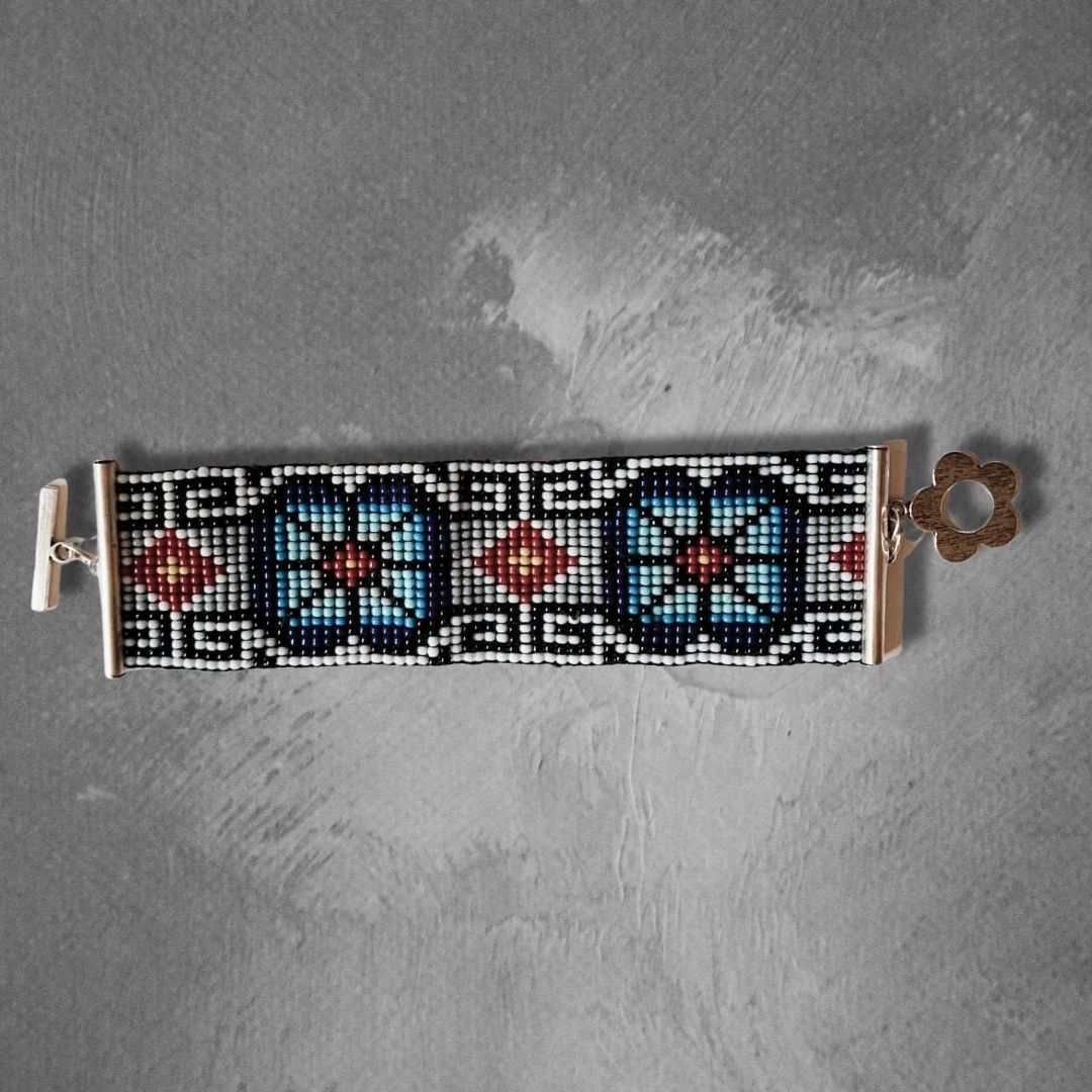 Wyrazista i rzucająca się w oczy bransoletka. Utkana ręcznie przez Kasię na krośnie z koralików Toho round 11. Kilka dni pracy. NIezwykły efekt