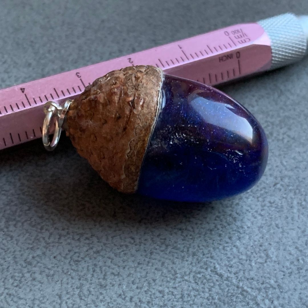 Wisior w kolorze głębokiego błękitu i lazuru w kształcie orzecha żołędzia. Z prawdziwą żołędziową czapeczką! Doskonale będzie się prezentował w połączeniu z rzemieniem lub wymyślnym sznurem.