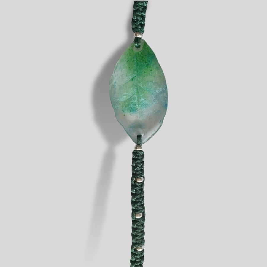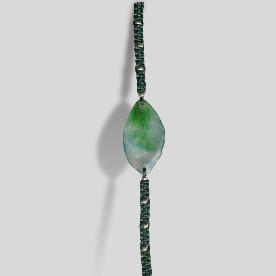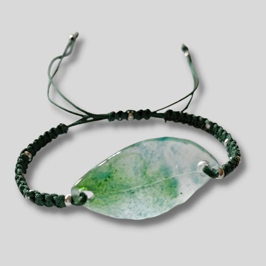 Bransoletka z liściem z żywicy z plecionego splotem makramowym sznurka.