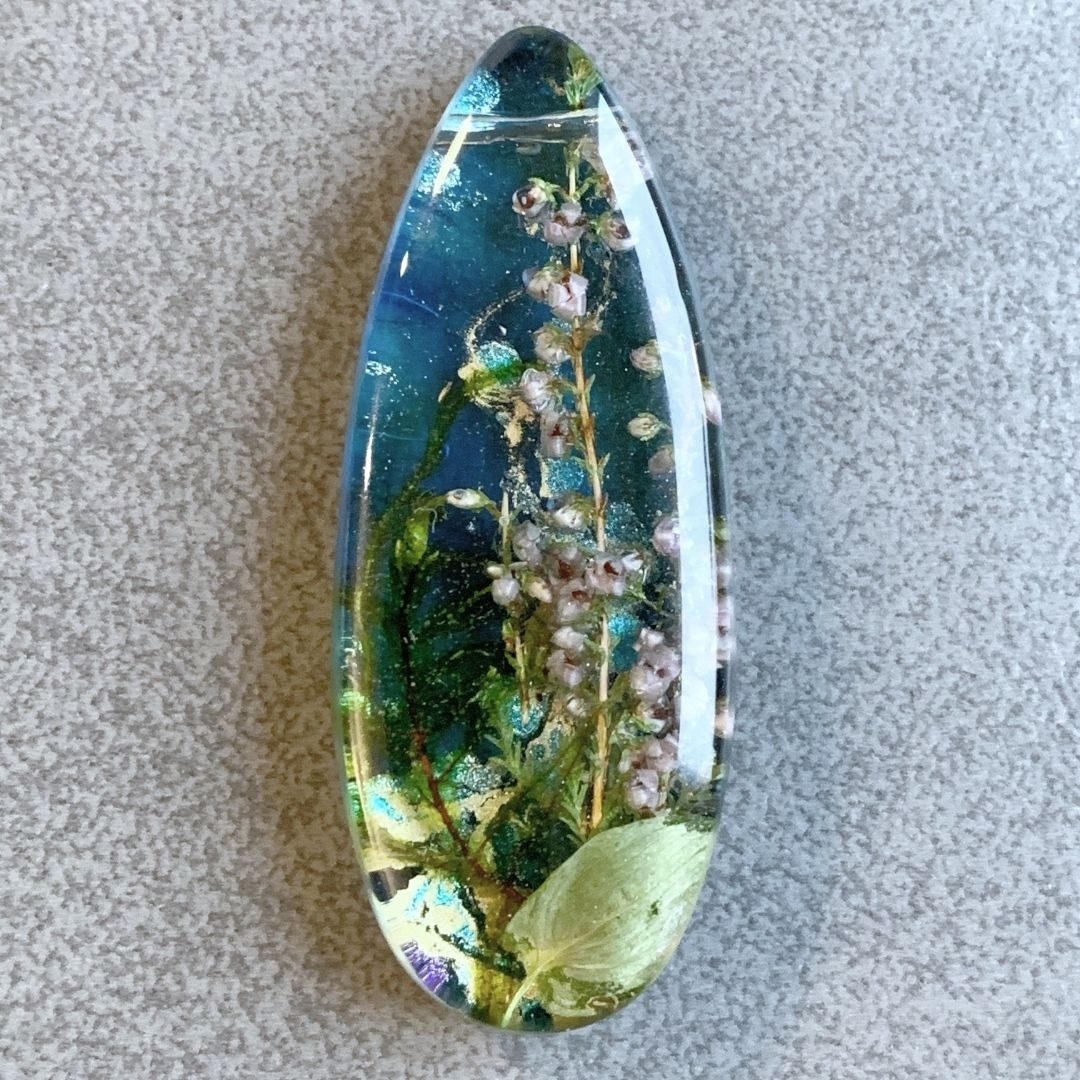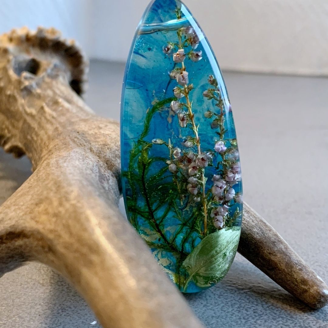Podłużny wisior z żywicy jubilerskiej z zatopionym kwiatem wrzosu otulonymi błękitem. Wyrazisty, przywodzący na myśl magię późnego lata. Lekki, ręcznie wylewany drobiazg, migotliwy i radosny. Doskonale będzie się prezentował w połączeniu z rzemieniem lub wymyślnym sznurem.