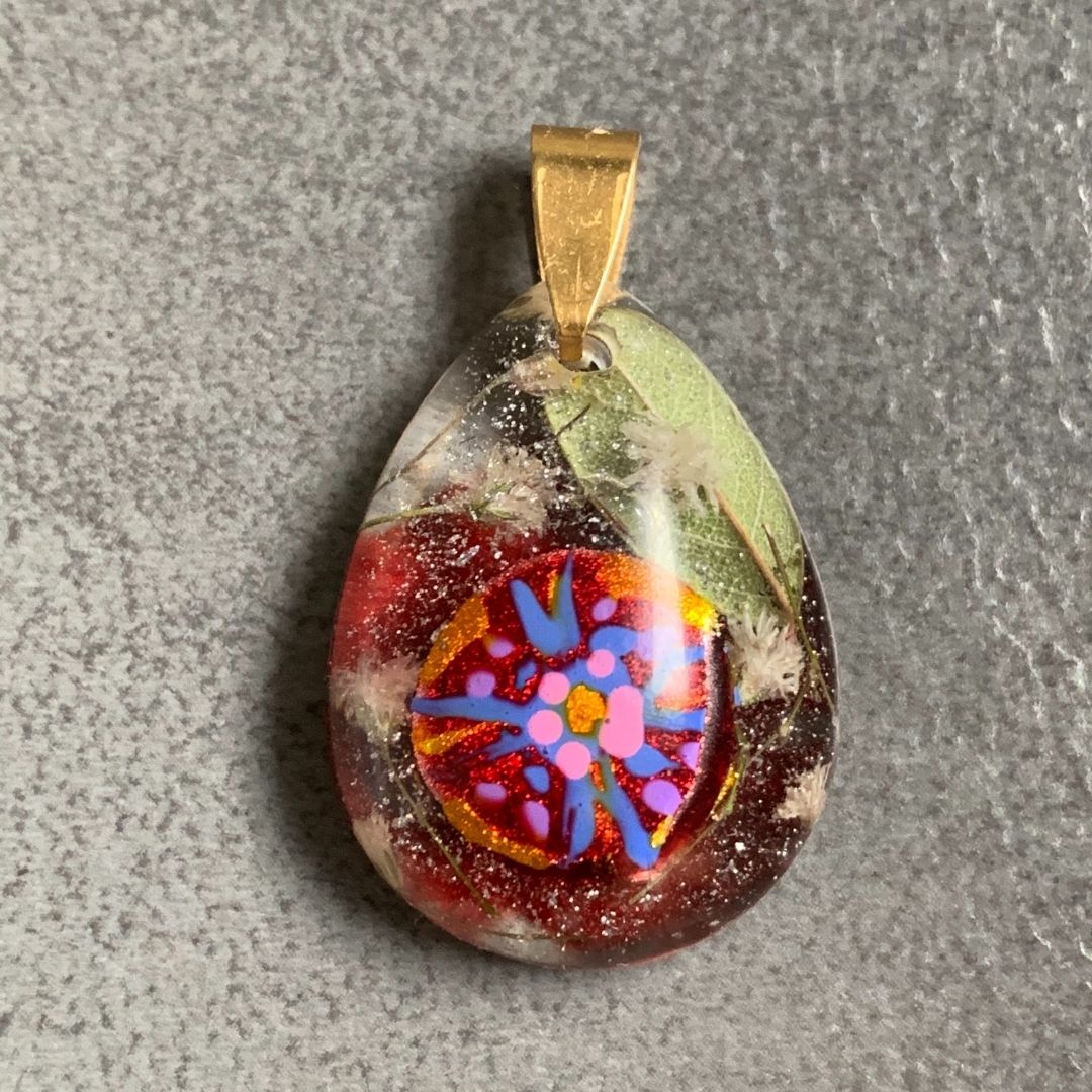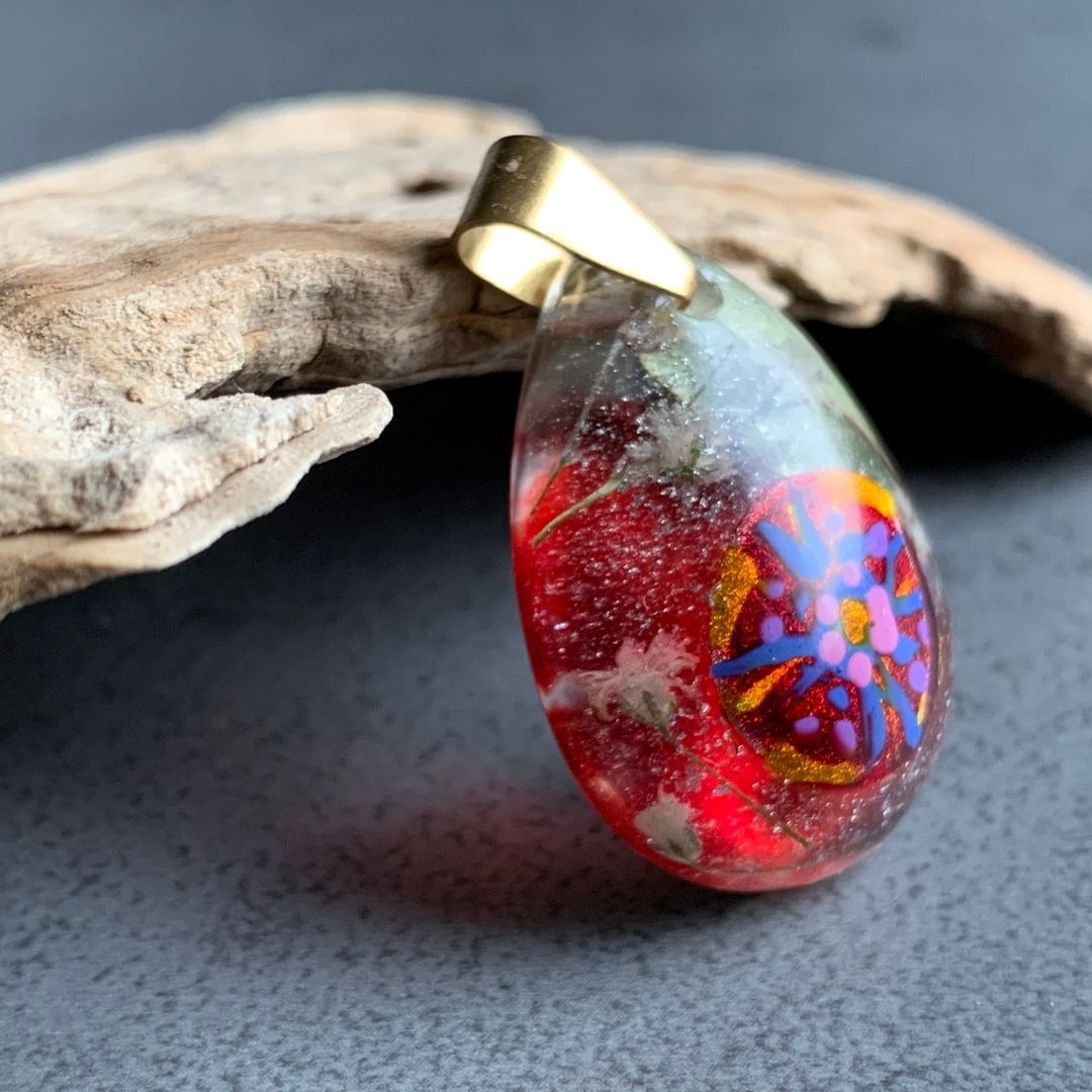 Wisior w kształcie kropli. Trochę jak ludowe malowanki, trochę jak mandala, trochę jak garść zerwanych na łące kwiatów. Ręcznie malowany wzór zatopiony w żywicy jubilerskiej wraz z drobnymi kwiatami i liśmi.