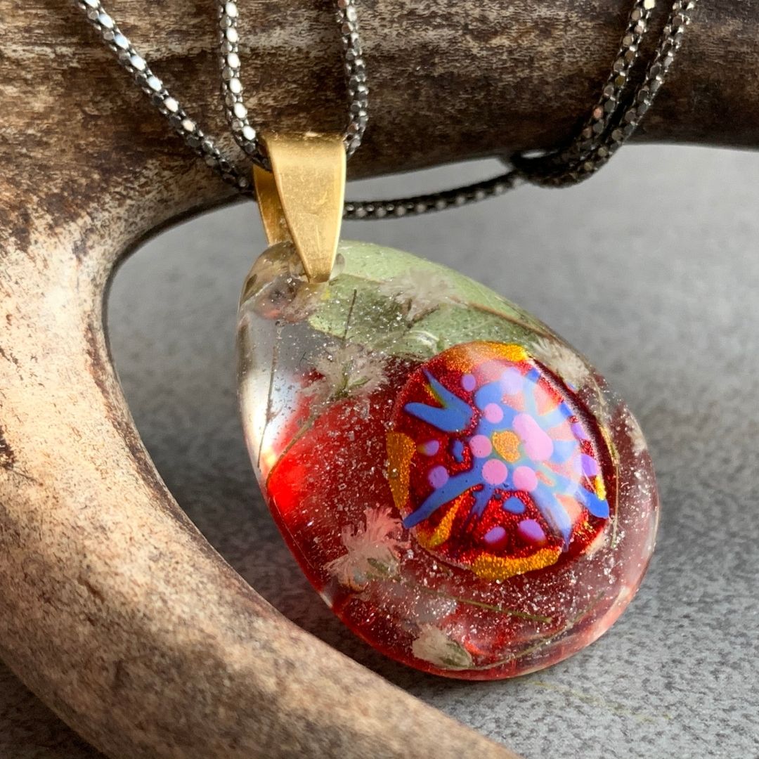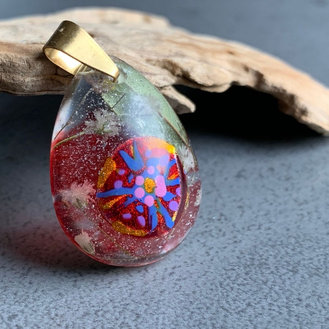 Trochę jak ludowe malowanki, trochę jak mandala, trochę jak garść zerwanych na łące kwiatów. Ręcznie malowany wzór zatopiony w żywicy jubilerskiej wraz z drobnymi kwiatami i liśmi.