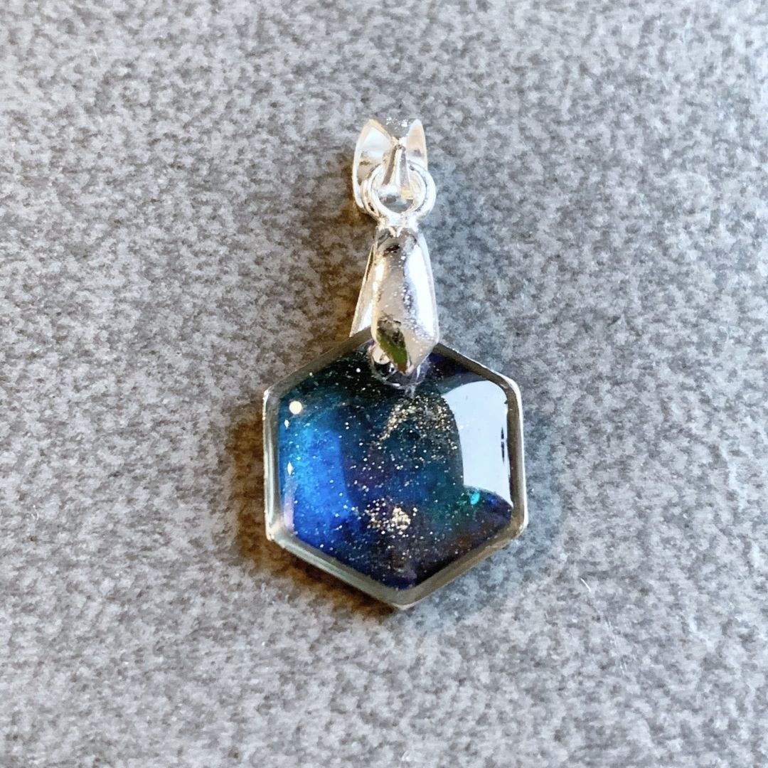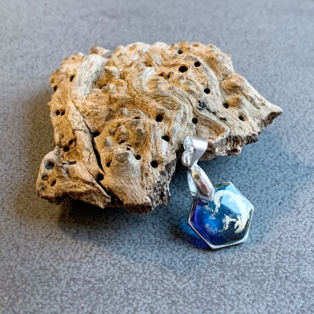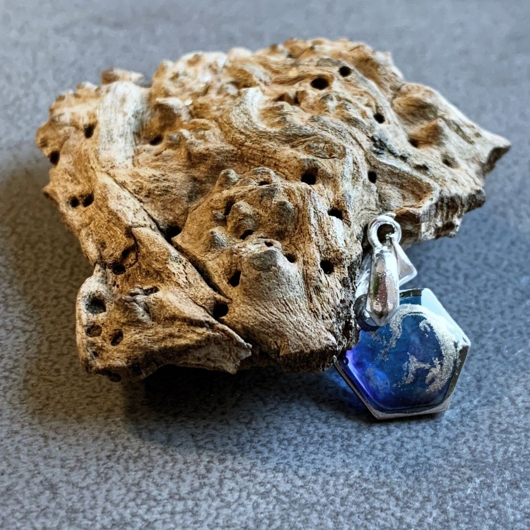 Wykonany z żywicy jubilerskiej na zawieszce ze stali szlachetnej (hipoalergicznej).