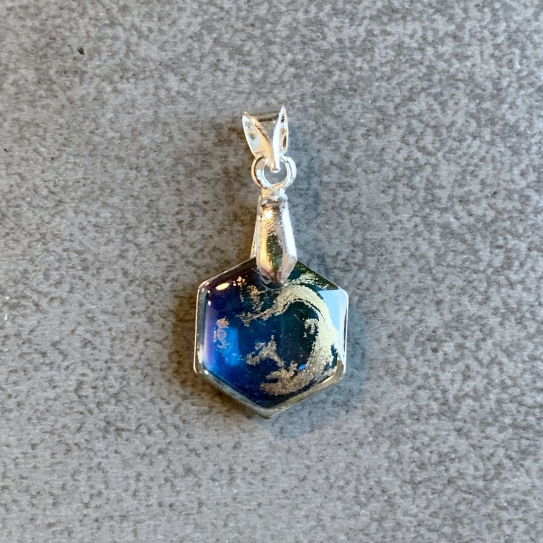 Maleńki wisiorek w odcieniach błękitu z zatopionym drobinkami złota. Tylko tyle. Leciusieńki, drobniutki, migotliwy.