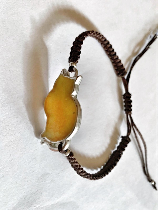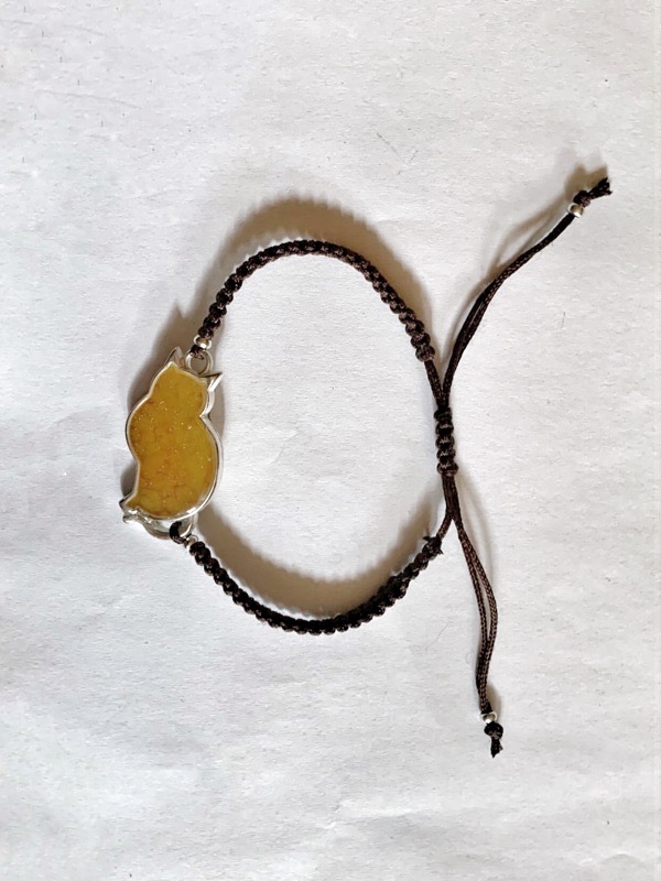 Bransoletka z kociej ramki wypełnionej żywicą i plecionego splotem makramowym sznurka.
