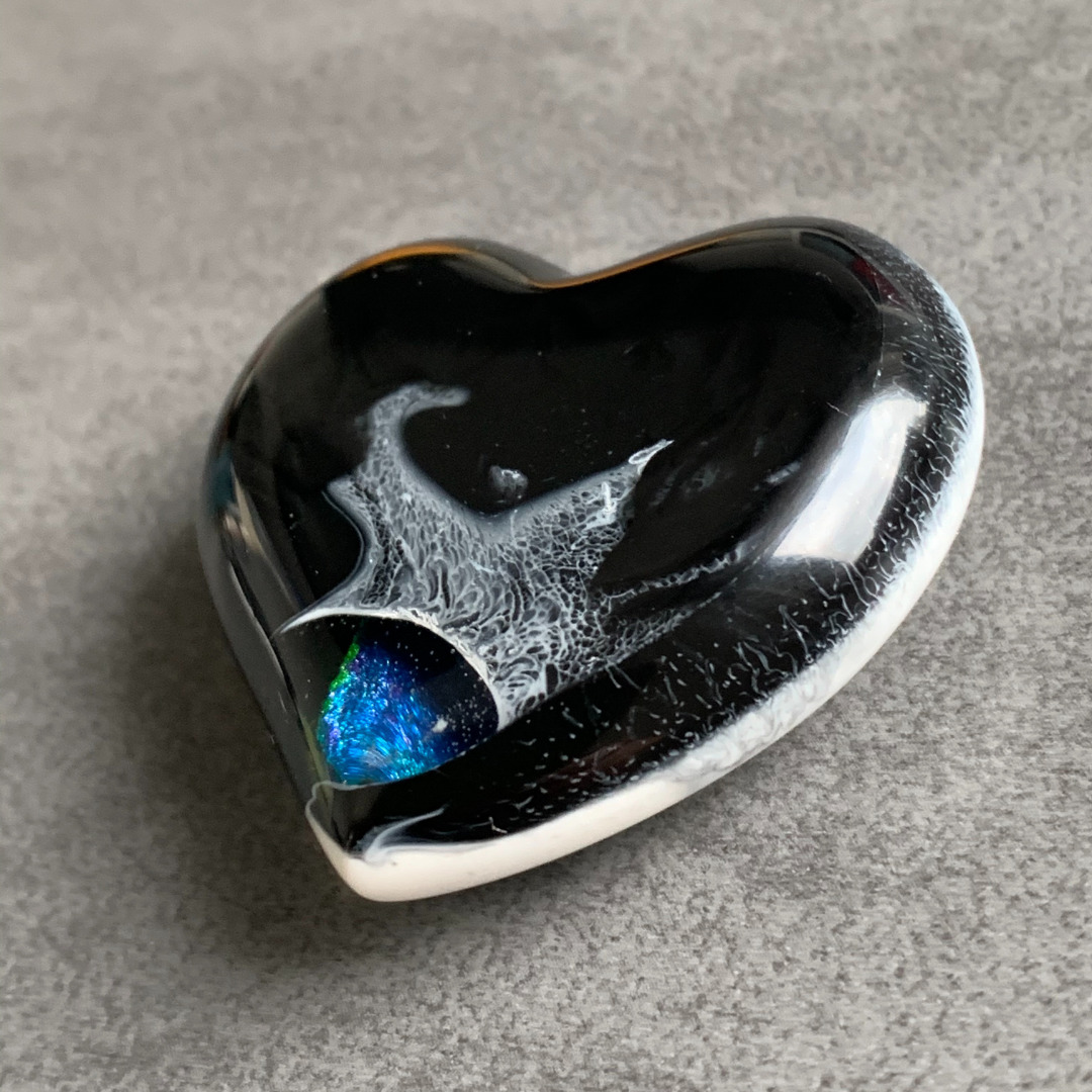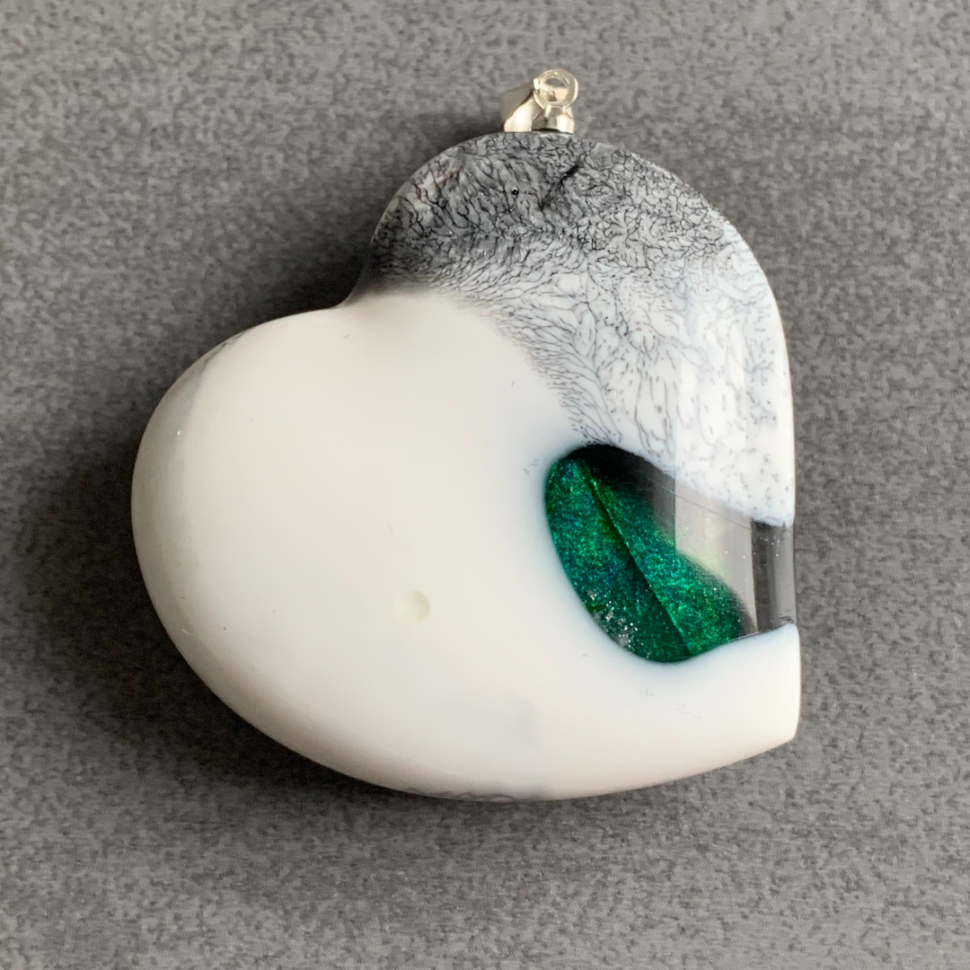 Czarno – białe dwustronne serce z ukrytym w środku zielono – niebieskim listkiem. Zaskakujące i intrygujące. Dość duży , masywny, ale zadziwiająco lekki, ręcznie wylewany i formowany wisior, migotliwy i pogodny. Doskonale będzie się prezentował w połączeniu z rzemieniem lub wymyślnym sznurem.