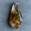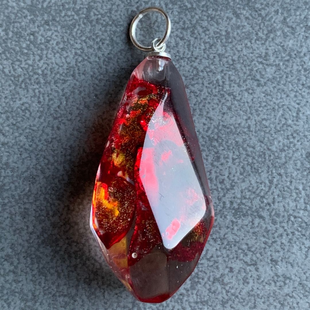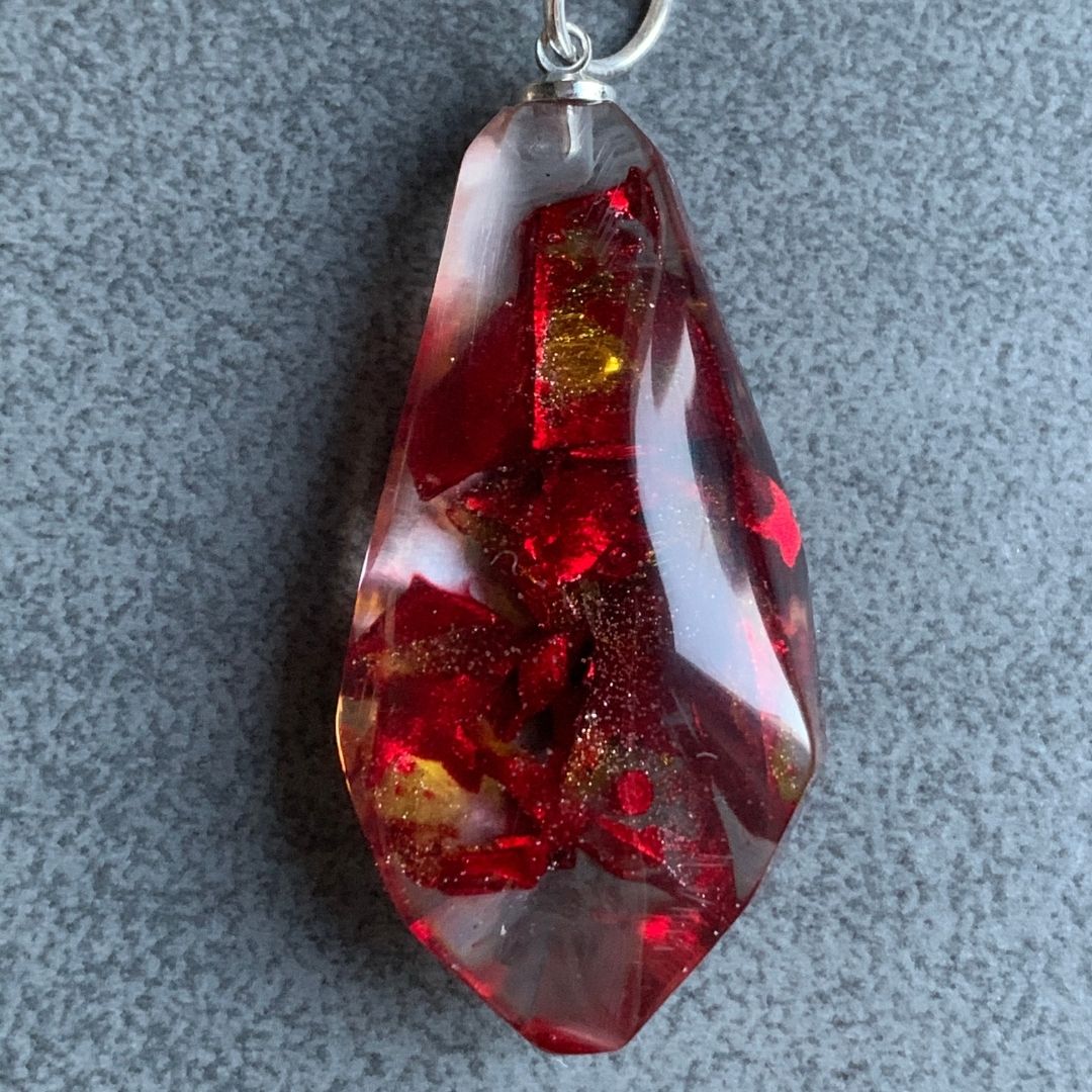 Zatopione w żywicy jubilerskiej kawałki czerwieni i złota.