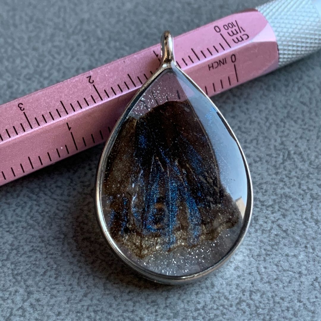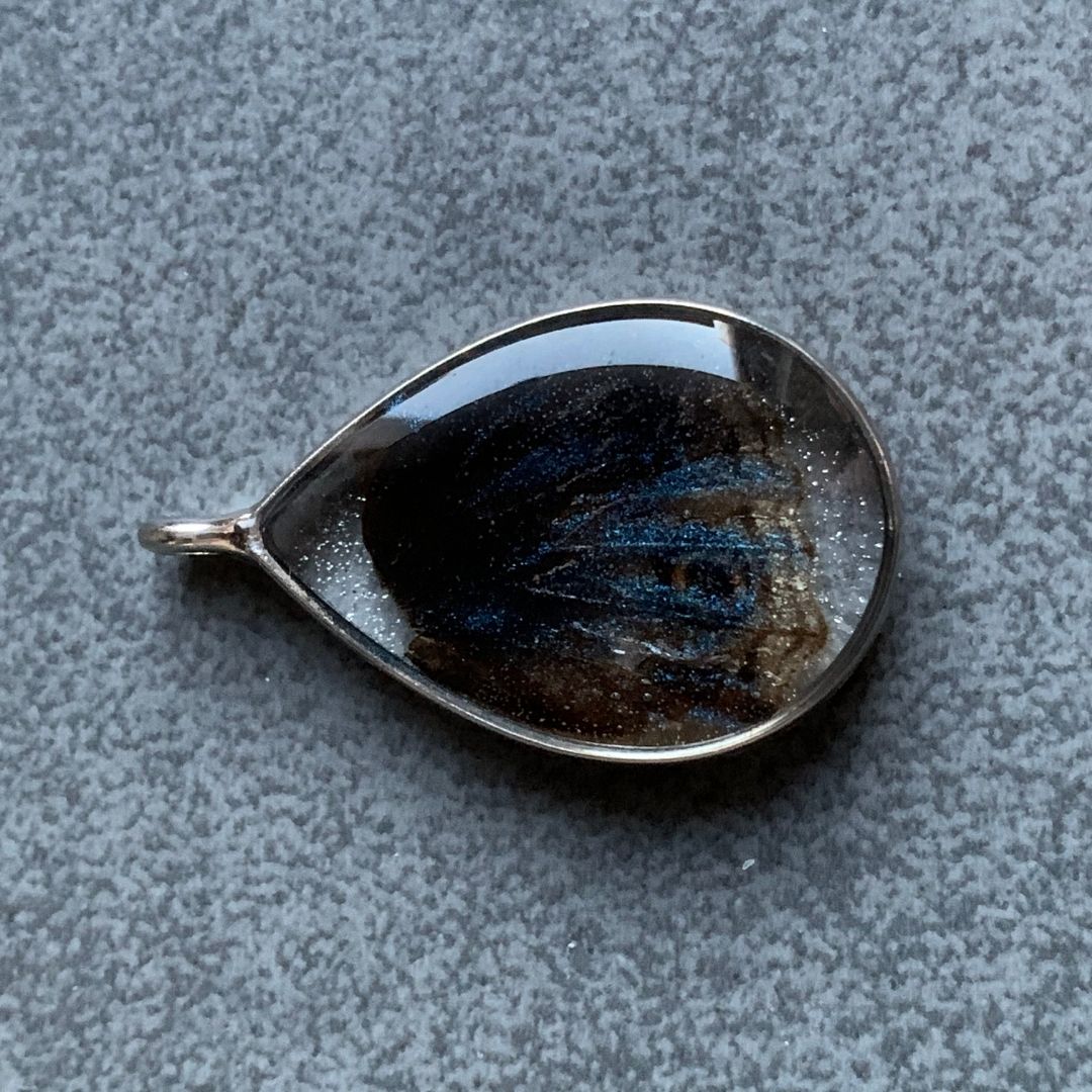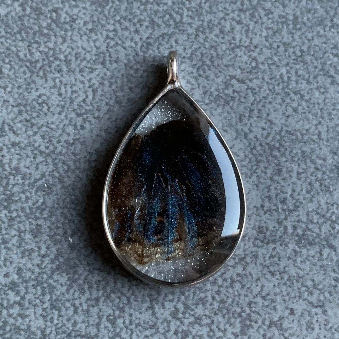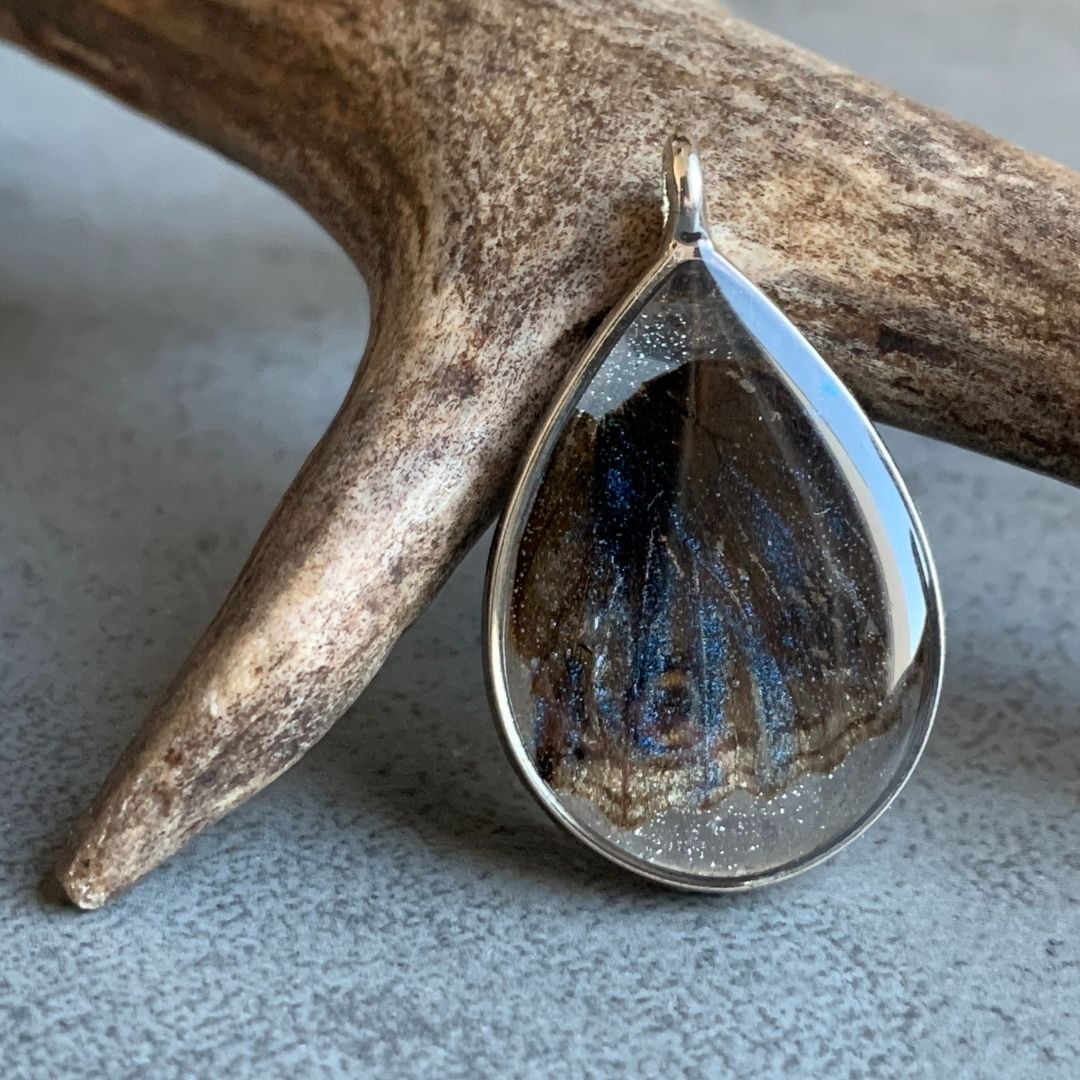 Motyle skrzydło zaklęte w żywicy jubilerskiej. Z odrobiną srebrnego pyłu dla dodania magii. Leciutki, ręcznie wylewany drobiazg, migotliwy i radosny z prawdziwym, naturalnym skrzydłem motyla. W metalowej ramce, na metalowej zawieszce. Doskonale będzie się prezentował w połączeniu z rzemieniem, czy wymyślnym sznurem.