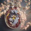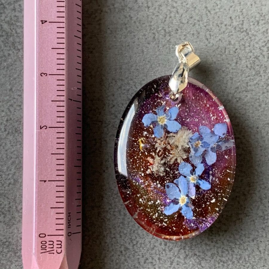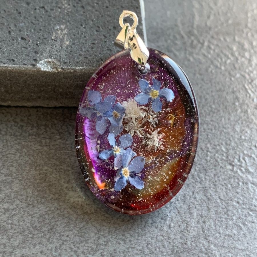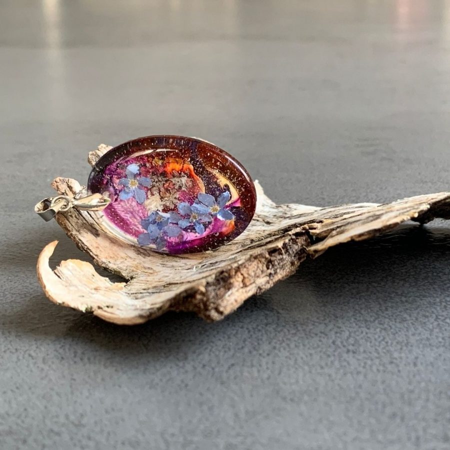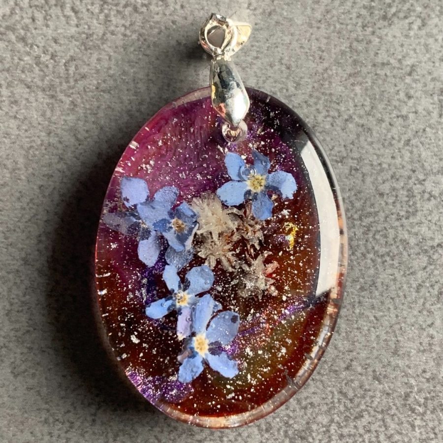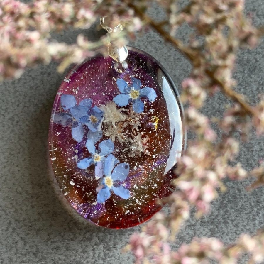 Niewielki wisior z żywicy jubilerskiej z zatopionymi kwiatami niezapominajek otulonymi srebrem, czerwienią i różem.