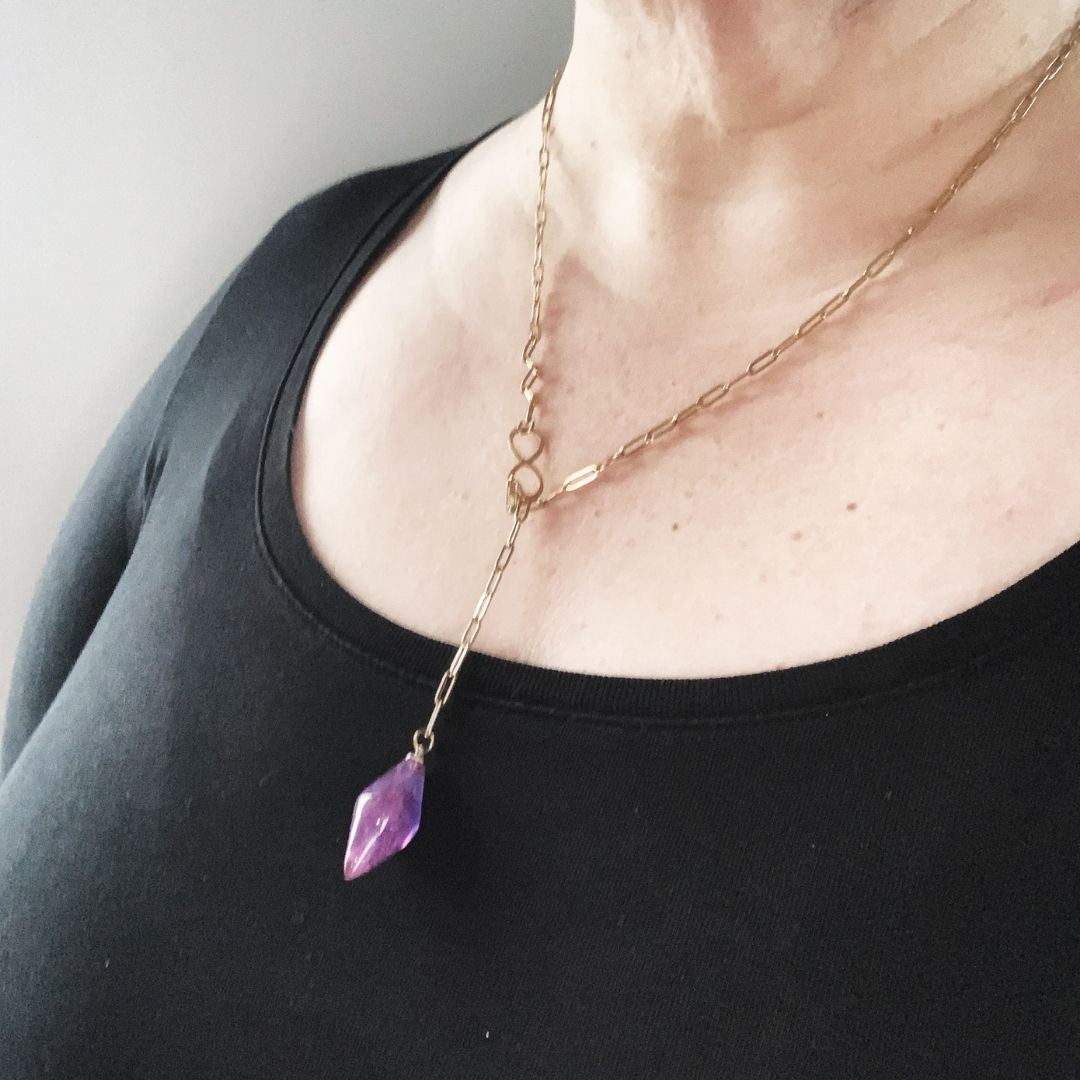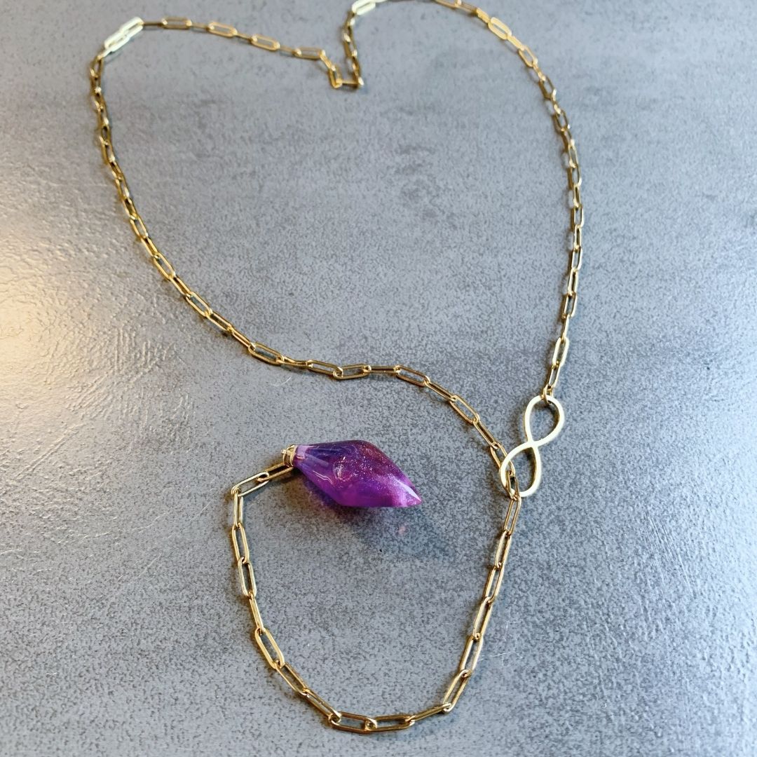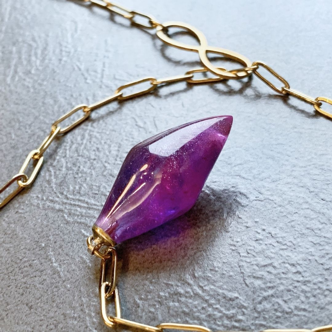 Wisior z żywicy jubilerskiej na łańcuszku ze stali szlachetnej w kolorze złotym (hipoalergicznej). Długość naszyjnika można dowolnie regulować.