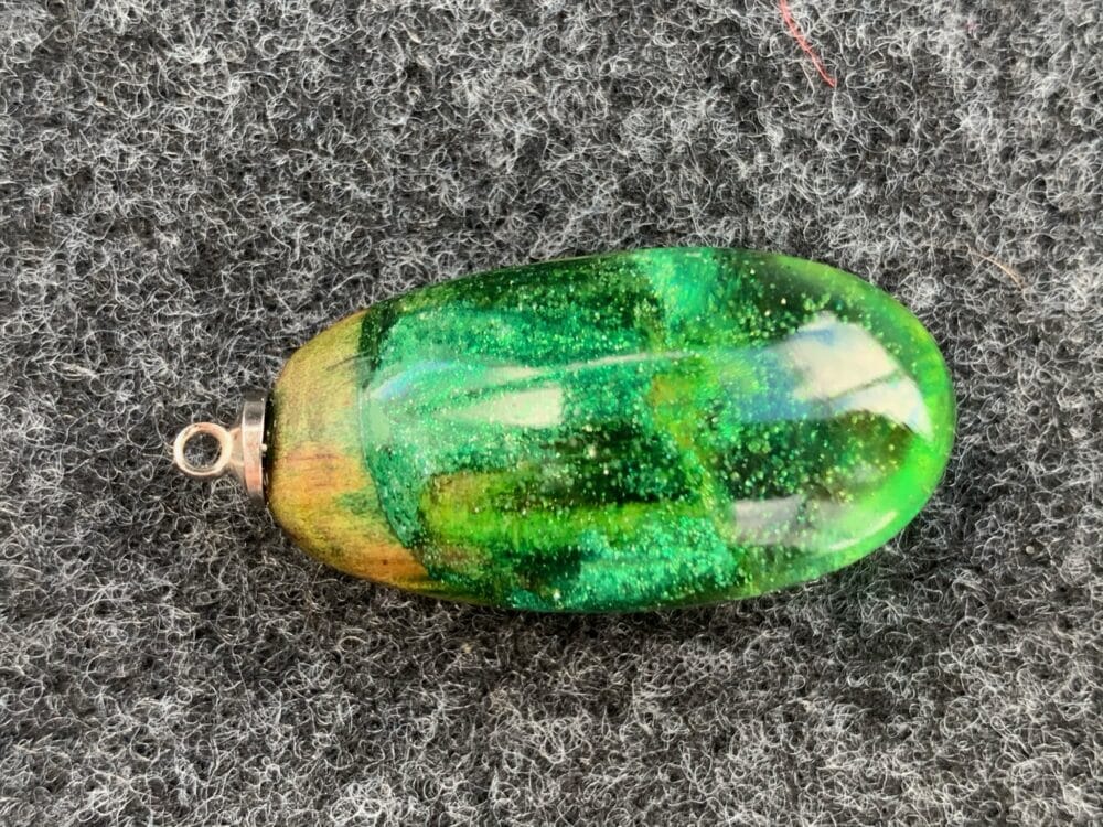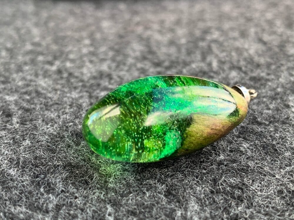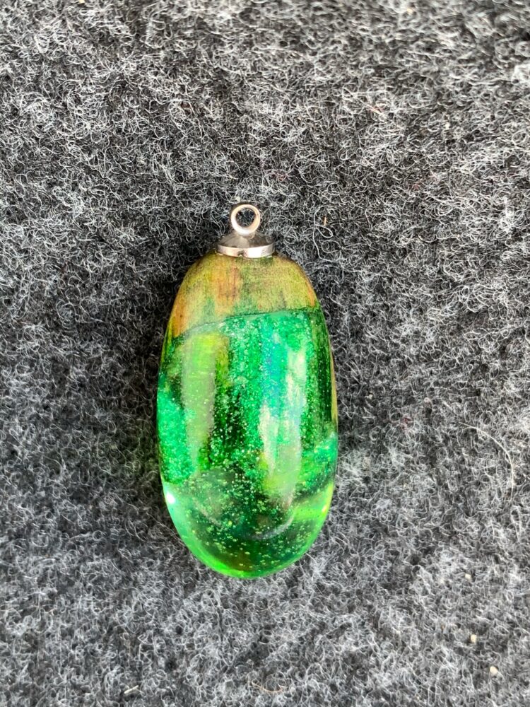 Magiczny wisior z żywicy epoksydowej, która doskonale komponuje się z drewnem wyrzuconym na nadmorski brzeg przez fale. Kropla zieleni. Leciutki, ręcznie wylewany drobiazg, migotliwy i radosny. Doskonale będzie się prezentował w połączeniu z rzemieniem, czy wymyślnym sznurem.