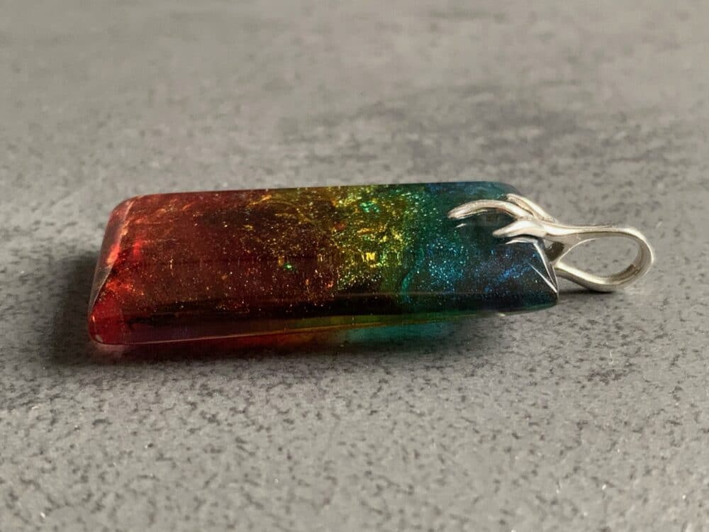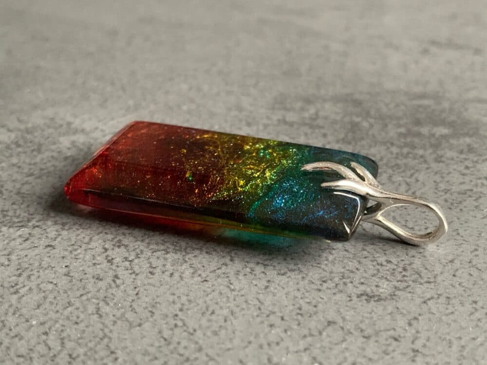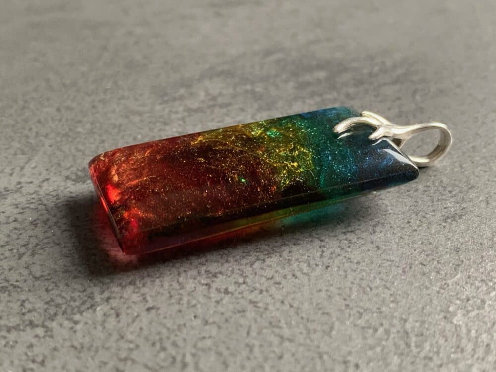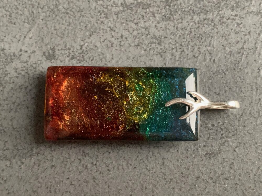 Prostokątny wisior z żywicy jubilerskiej. Niezwykle radosna mieszanina metalicznych barw, na fantazyjnej zawieszce z srebra próby 925. Nie pozwoli Ci pozostać niezauważoną. Lekki, bajeczny kolorowy ręcznie wylewany drobiazg, migotliwy i radosny. Doskonale będzie się prezentował w połączeniu z rzemieniem, czy wymyślnym sznurem, a może na łańcuszku?