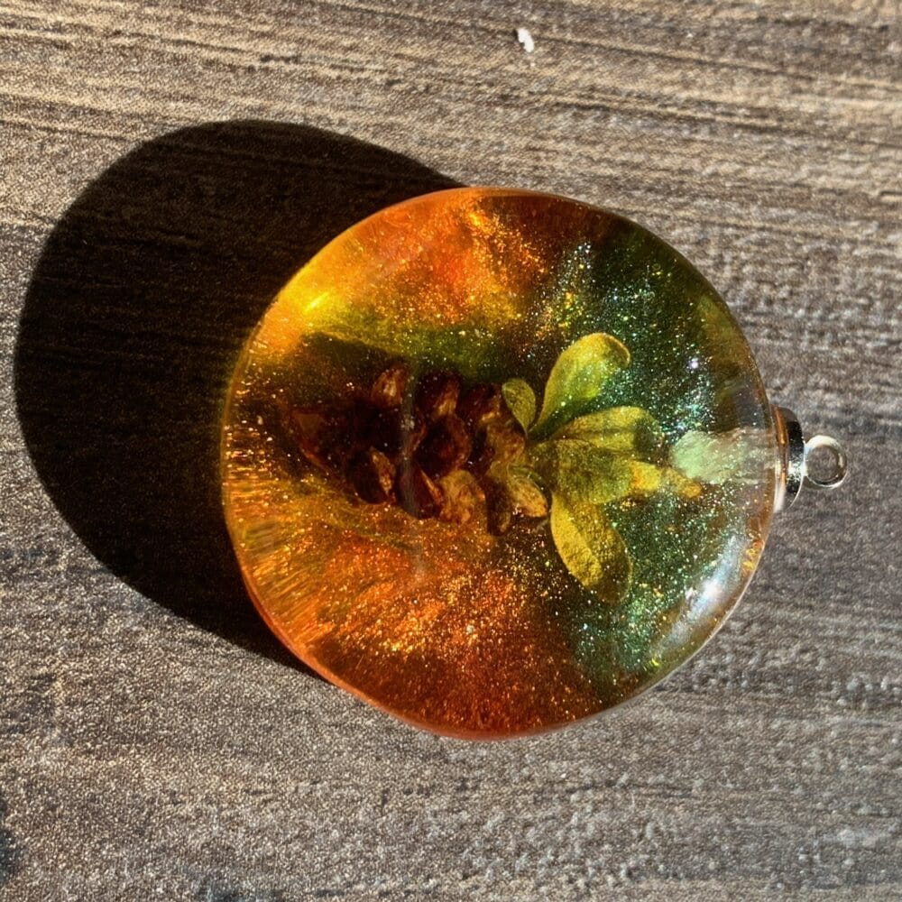 Niewielki wisior z żywicy jubilerskiej z zatopioną maleńką szyszką otuloną zielenią, złotem i miedzią. Przywodzi na myśl miniaturowy owoc ananasa. Powiew egzotyki w kolorach zachodu słońca. Lekki, ręcznie wylewany drobiazg, migotliwy i radosny. Doskonale będzie się prezentował w połączeniu z rzemieniem lub wymyślnym sznurem.