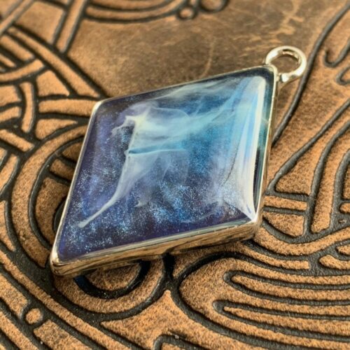 Gdyby magię ubrać w kształt i kolor – to tak bym ją sobie właśnie wyobrażała. Snujące się senne i tajemnicze mgły w oparach błękitu. Lekki, ręcznie wylewany drobiazg, migotliwy i radosny. Doskonale będzie się prezentował w połączeniu z rzemieniem lub wymyślnym sznurem.
