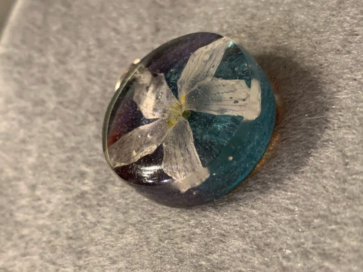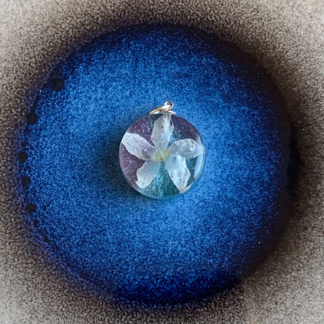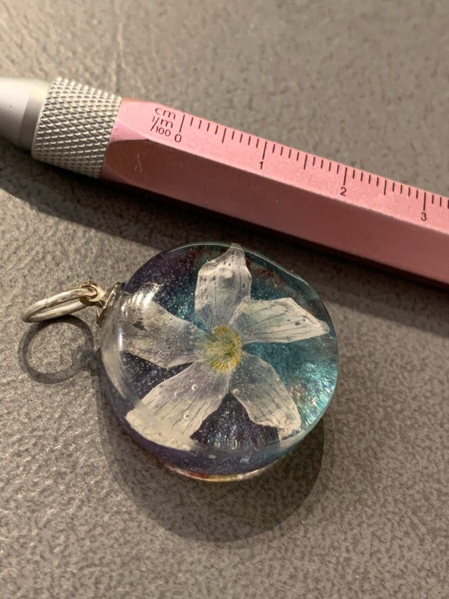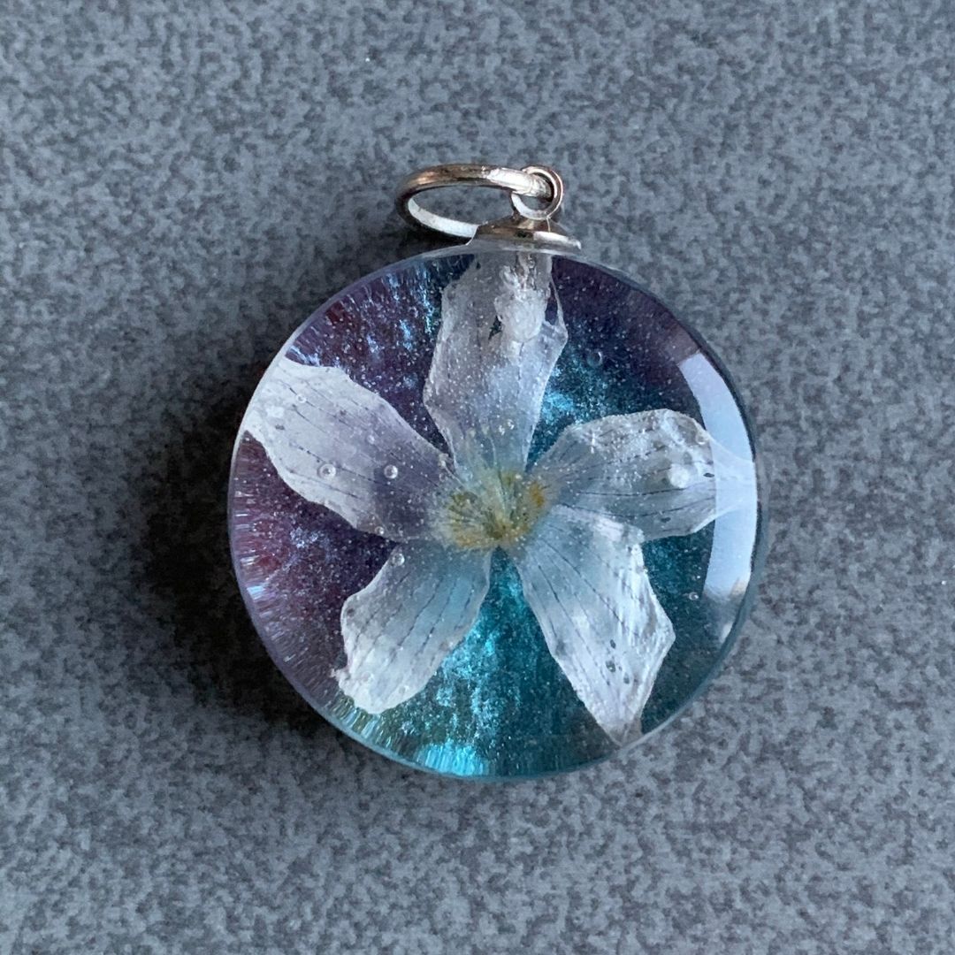 Wykonany z żywicy jubilerskiej na metalowej zawieszce z zatopionymi naturalnymi kwiatami.