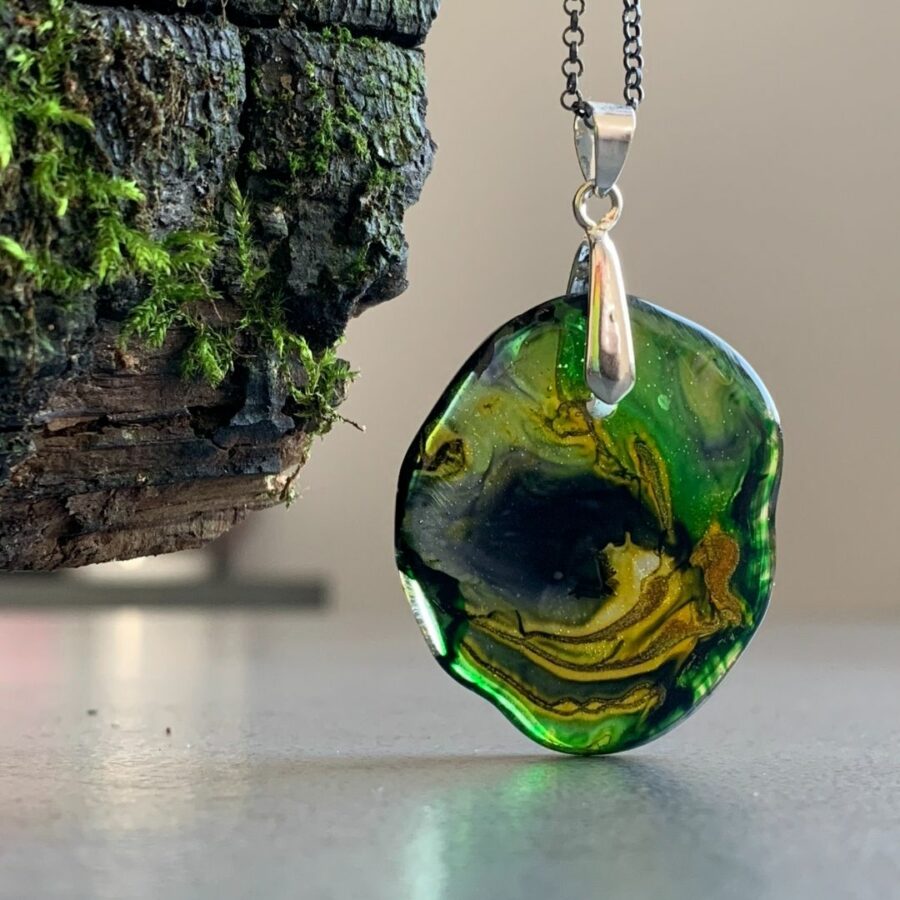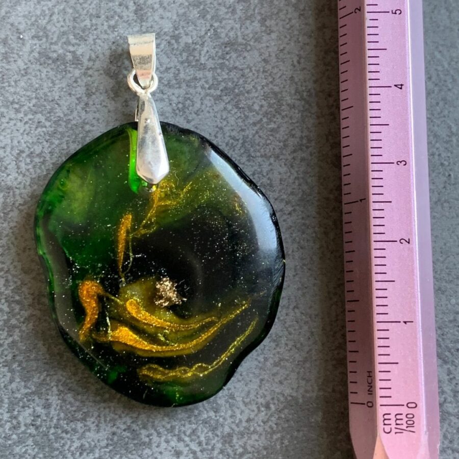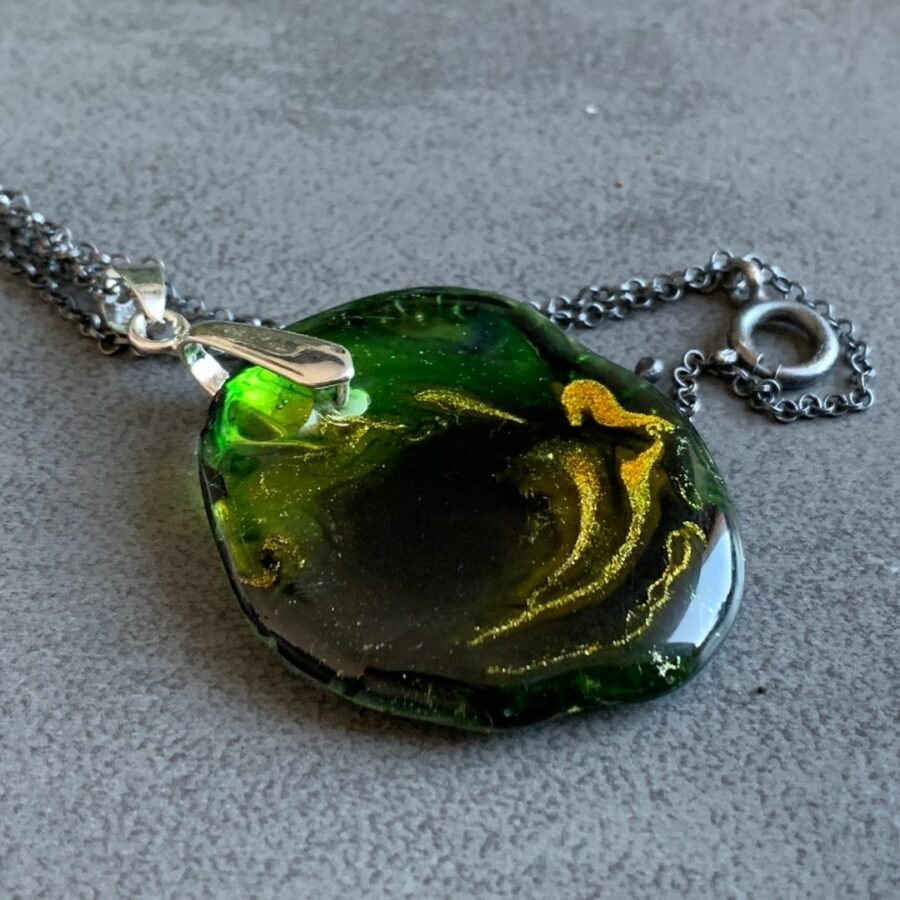 Wykonany z żywicy jubilerskiej na metalowej zawieszce.